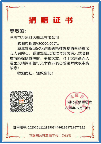 國家面臨如此災難,豈能無動于衷,慈烏反哺,是時候回報國家的時候,經過領導層溝通,萬家燈火搬家公司決定向湖北慈善總會捐獻20000元人民幣,涓涓細流匯聚大海,希望國家盡快戰勝瘟疫。