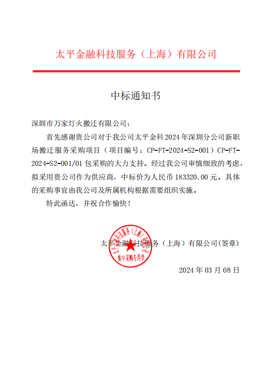 我司預祝本次的太平金融科技服務(上海)有限公司公司深圳分公司新職場搬遷項目合作愉快。
